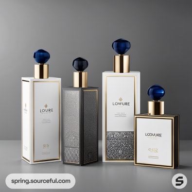 White and gold bottles with decorative caps on sleek packaging.