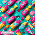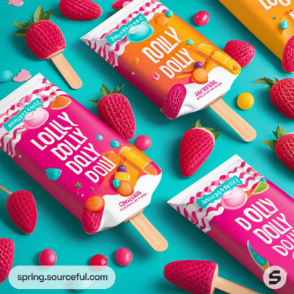Bright ice cream wrappers with strawberry decorations on teal background.
