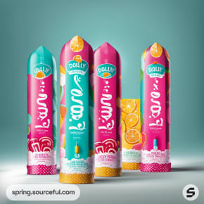 Tall ice cream wrappers with fruit designs on light blue background.