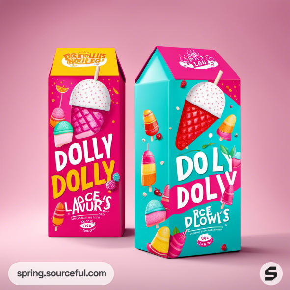 Variety of ice cream boxes with vibrant designs on pink background.