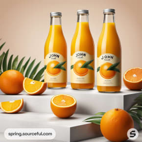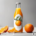Two glass bottles of orange juice with leaf and orange illustrations.