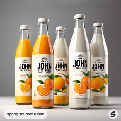Five glass bottles of various juices with orange labels and illustrations.