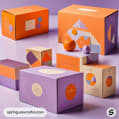 Colorful geometric packaging boxes on a purple background.