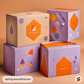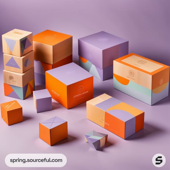 Geometric-patterned cardboard boxes in purple and orange against a warm background.