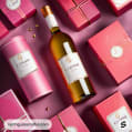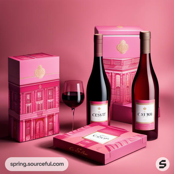 Luxurious pink and gold packaging with a wine bottle and glass.