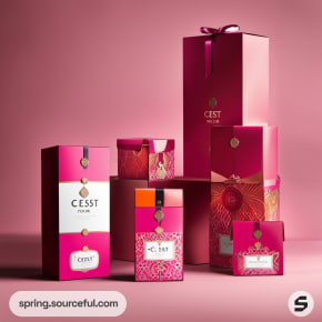Pink and gold themed wine packaging with bottles and decorative boxes.