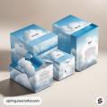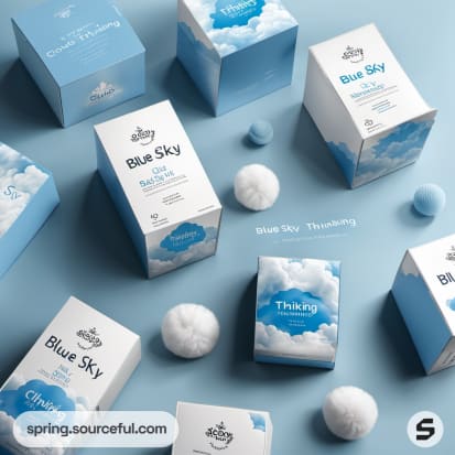 Assorted blue packaging with a cloud motif.