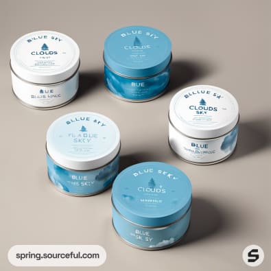 Five round tins with blue sky and clouds design.