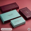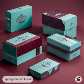 Assorted teal and burgundy boxes with minimalist golden designs.