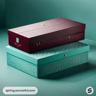 Rectangular teal and burgundy gift boxes with embossed textures.