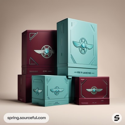 Stacked teal and burgundy boxes with wing emblems and designs.