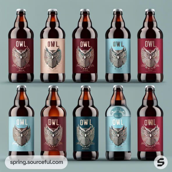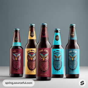 Row of owl-themed beer bottles with varying labels in maroon and turquoise.