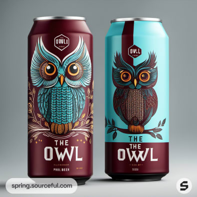 Two owl-themed beer cans, one in maroon, one in turquoise.