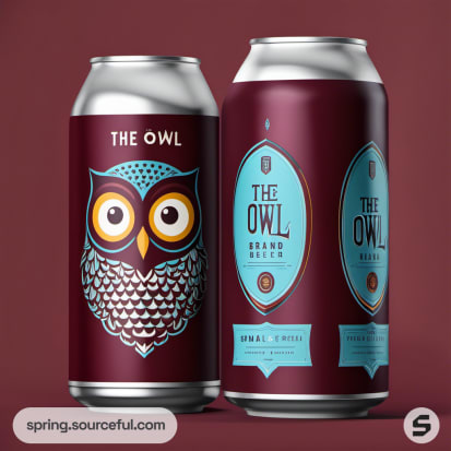 Maroon owl-themed beer cans with colorful owl illustration.