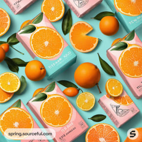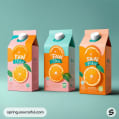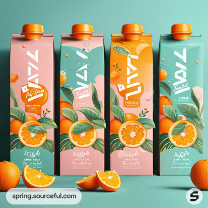 Tropical juice packaging with oranges and teal, pink, orange colors.