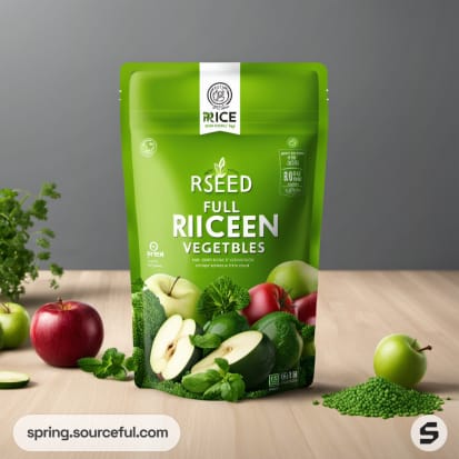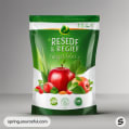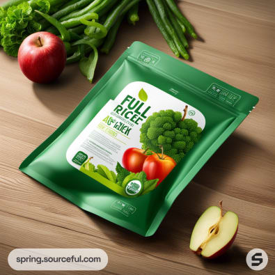 Green resealable pouch with apples and greens illustration.