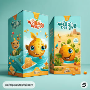 Two boxes with geometric and fruit designs in orange and teal.