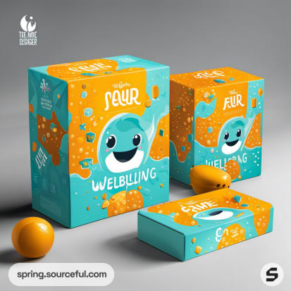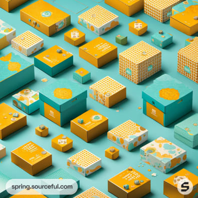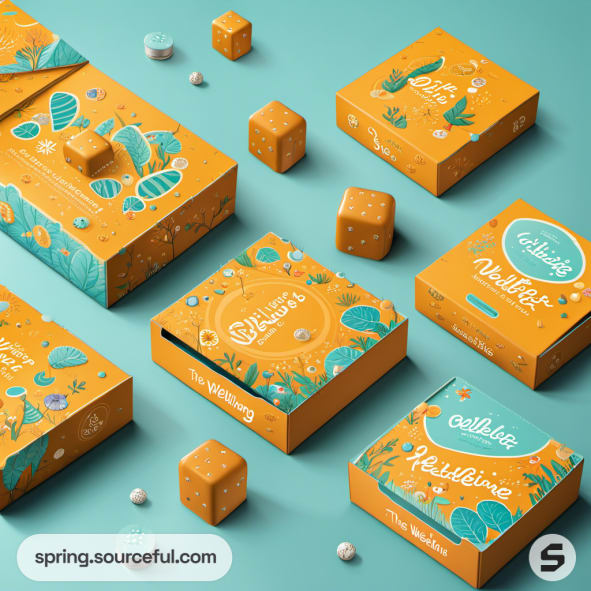 Boxes with geometric shapes and a wave design in orange and teal.