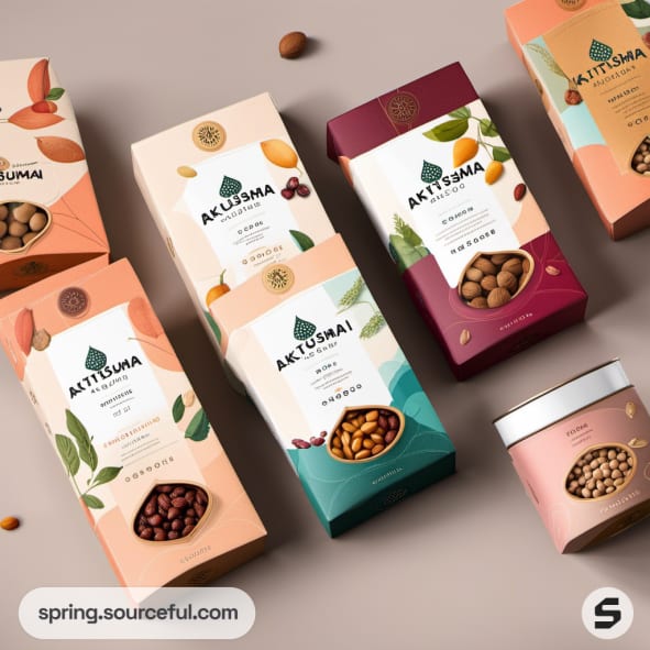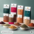 Boldly colored snack pouches with illustrations of nuts and spices.