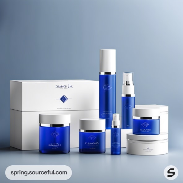 Blue and white skincare product boxes displayed