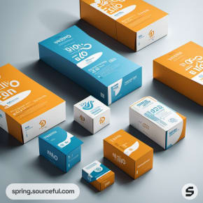Blue and orange packaging boxes of various sizes arranged on a white surface.