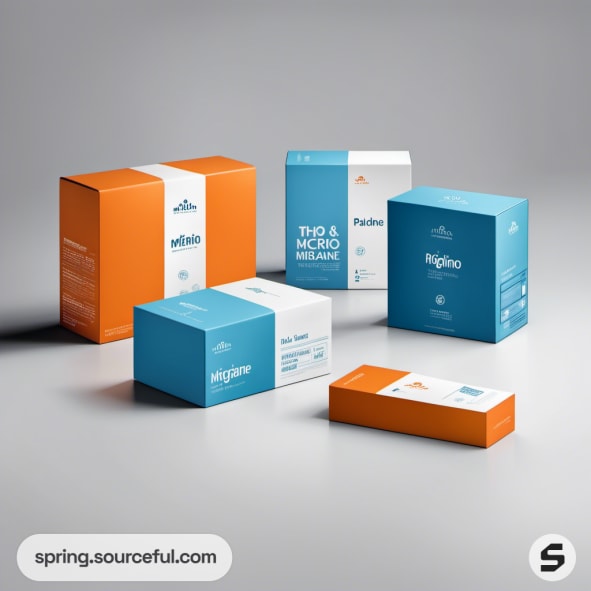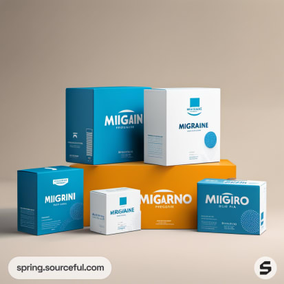 Various colored boxes with "Migraine Relief" text, arranged on a beige background.