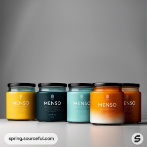 Set of candles in glass jars with black lids, showcasing different wax colors on a gray background.