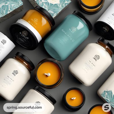Assorted candle jars with black lids and labels, displayed on a light green surface.