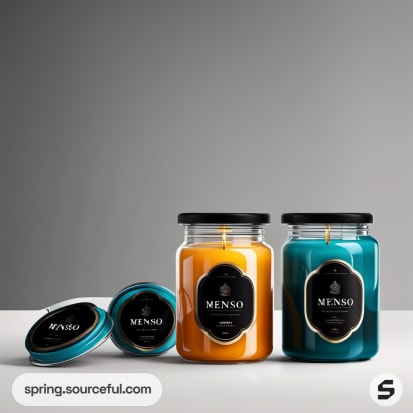 Two large square glass candles with black labels, alongside a smaller candle with a teal lid.