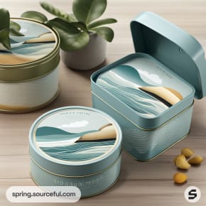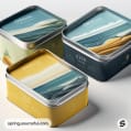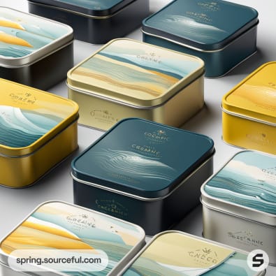 Square tins with landscape design, featuring blue waves and beige hills, on a wooden surface with small plants.