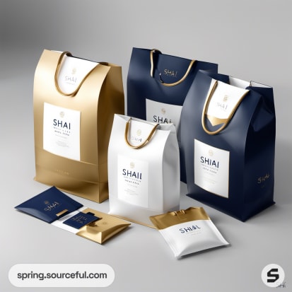 White, gold, and blue shopping bags with elegant design.