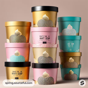 Tall stacks of ice cream tubs in gold, pink, and teal with decorative patterns.
