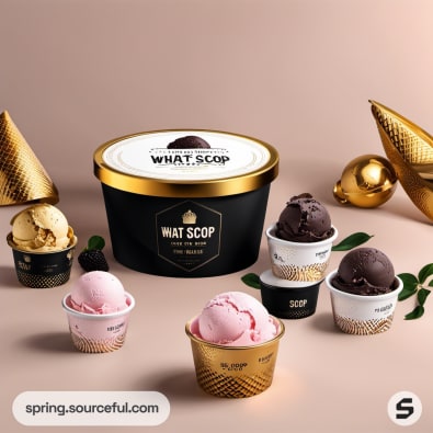 Ice cream tub with gold lid and small cups on a beige surface with golden chocolates.