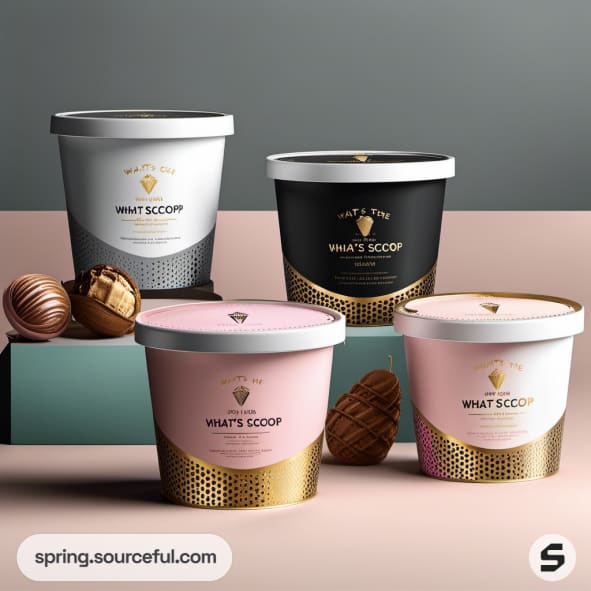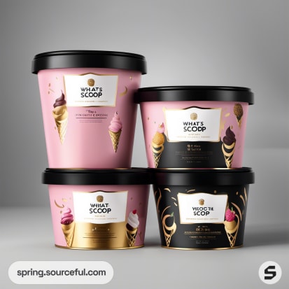Four ice cream tubs in pink and black with gold accents on a dark background.