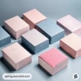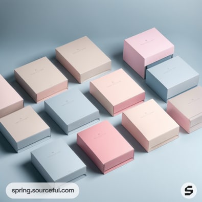 Pastel-colored gift boxes arranged in grid, featuring shades of pink and blue on a light blue background.