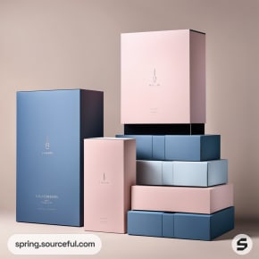 Blue and pink stacking boxes with minimalist design on a neutral background.