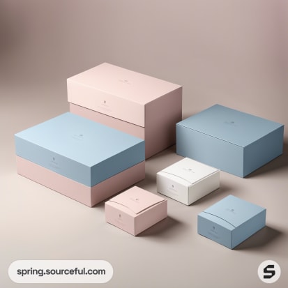 Pastel-colored stackable boxes in blue, pink, and white on a beige background.