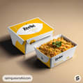 White and yellow meal box with an open dish of food on beige background.