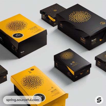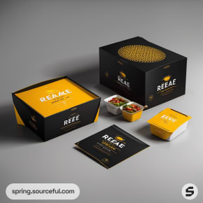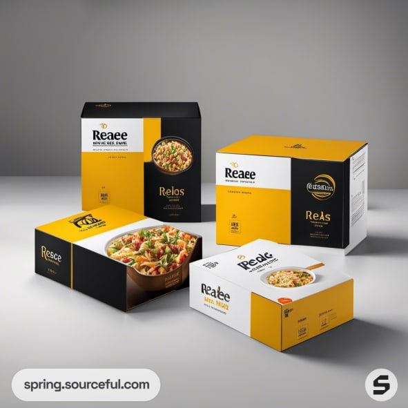 Assorted black and yellow meal packaging with stacked boxes.