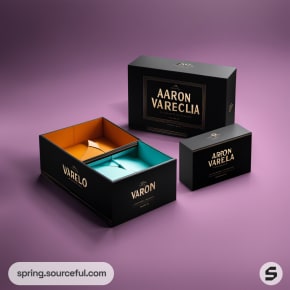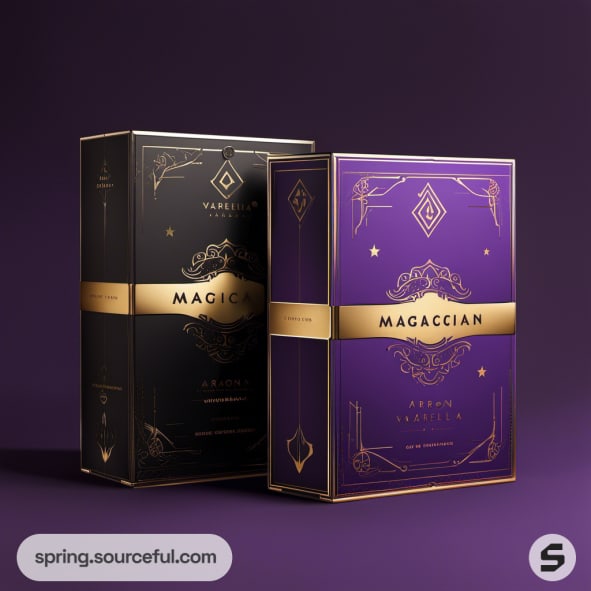 Black and purple luxury box with gold ornate design.