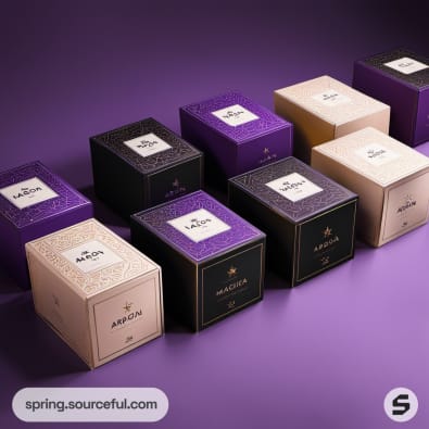 Set of purple and gold boxes on a vibrant background.