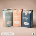 Set of three paper packages in mint green, peach, and blue with floral accents on top.