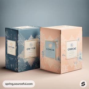 Two elegant boxes with floral patterns, one blue and one peach, on a neutral background.