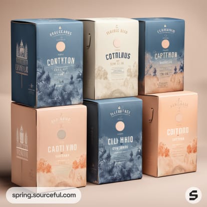 Stacked cardboard boxes with pastel and navy watercolor designs and labels, on a beige background.