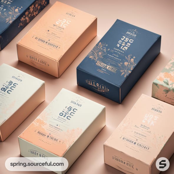 Assorted pastel and dark themed rectangular boxes with floral designs and minimalist typography on a light peach background.