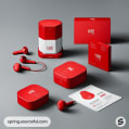 Red and white earbud box with various packaging items.
