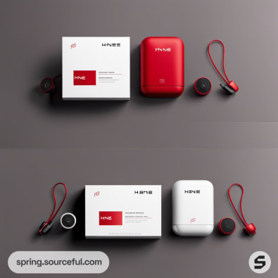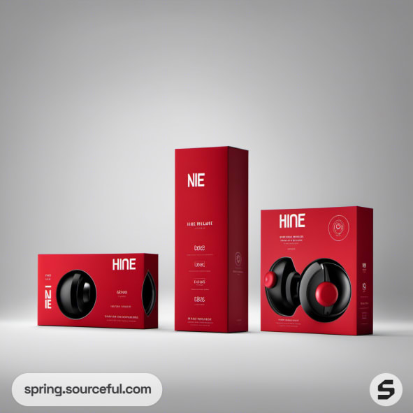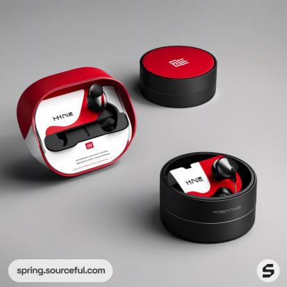 Red and black earbud packaging with tall and rectangular boxes.