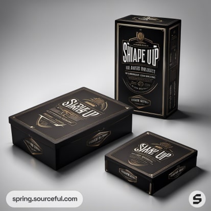 Tall black boxes with elegant 'Shape Up' branding in white lettering.
