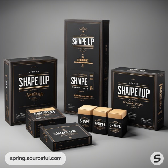 Black cardboard boxes with 'Shape Up' branding in gold lettering.