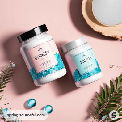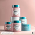 Two jars with pink and blue labels placed on a soft pink surface with foliage accents.